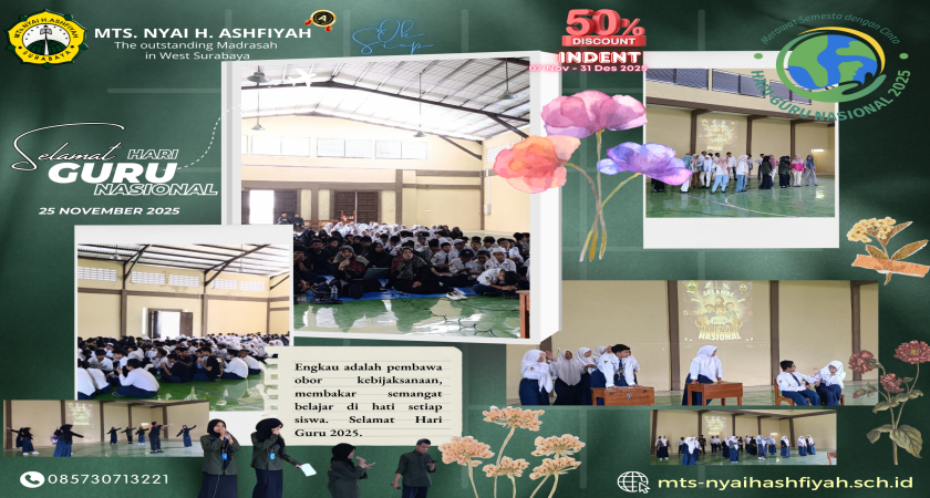 Assalamualaikum wr wb, halo semuanyaa gimana nih kabarnya semoga sehat selalu yaa, jadi pada tanggal 25 november kemarin MTS nyai h. Ashfiyah melakukan kegiatan hari guru yang pastinya kita rayakan setiap 1 tahun sekali. Lalu pada sekitar jam 07.00 an kita melaksanakan sholat dhuha di mushola , tak lama kemudian setelah sholat dhuha kita semua langsung disuruh ke gor bulu, setelah sampai di gor bulu kita semua disuruh mencari posisi untuk duduk, lalu akhir nya acara nya pun dimulai, acara ini dibuka dengan video kenangan bapak dan ibu guru, setelah itu banyak sekali penampilan yang menarik dari angkatan 40, angkatan 41, angkatan 42 dan pastinya osim. Acara ini berjalan kurang lebih selama 2-3 jam an, lalu akhirnya acara nya pun telah selesai kami pun kembali ke sekolah dan istirahat sampai waktu sholat dzuhur. Lalu pada jam 12:00-12:20 kami melaksanakan sholat dzuhur dan setelah sholat dzuhur kita melakukan foto angkatan dari 40-42 , terus setelah itu kami pun pulang kerumah kami masing masing, dan itu dia acara hari guru kami dan saya ingin mengucapkan selamat hari guru teruntuk bapak dan ibu guru semua.Terima kasih assalamualaikum wr wb