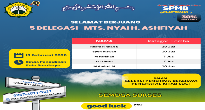 MTs NYAI H. ASHFIYAH Mengeluarkan 5 Delegasi untuk mengikuti kegiatan ini, dan Alhamdulillah LOLOS 1, semoga bisa menjadi motivasi bagi siswa-siswi yang lain untuk terus semangat belajarnya dan juga hafalan Al-Qur’annya.